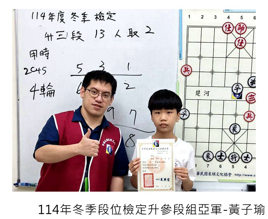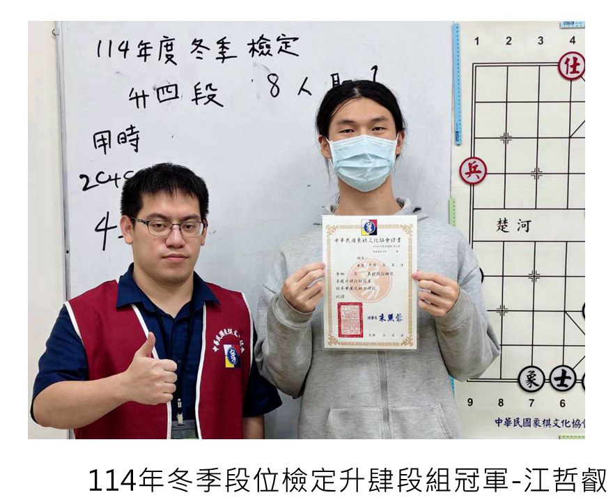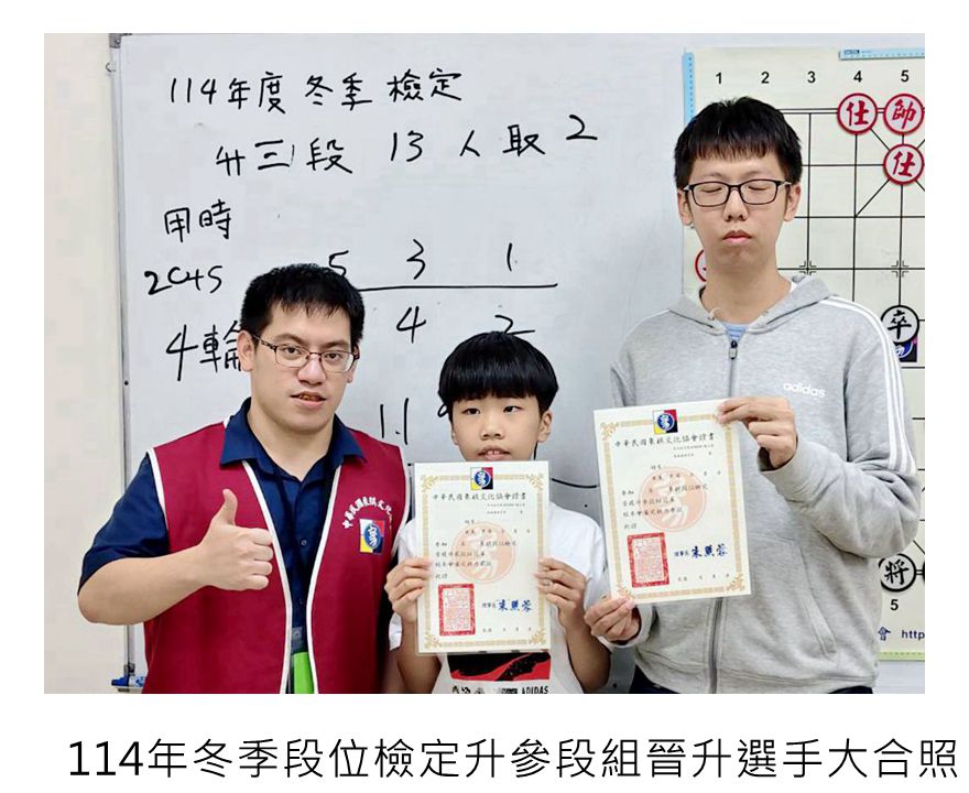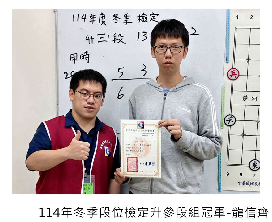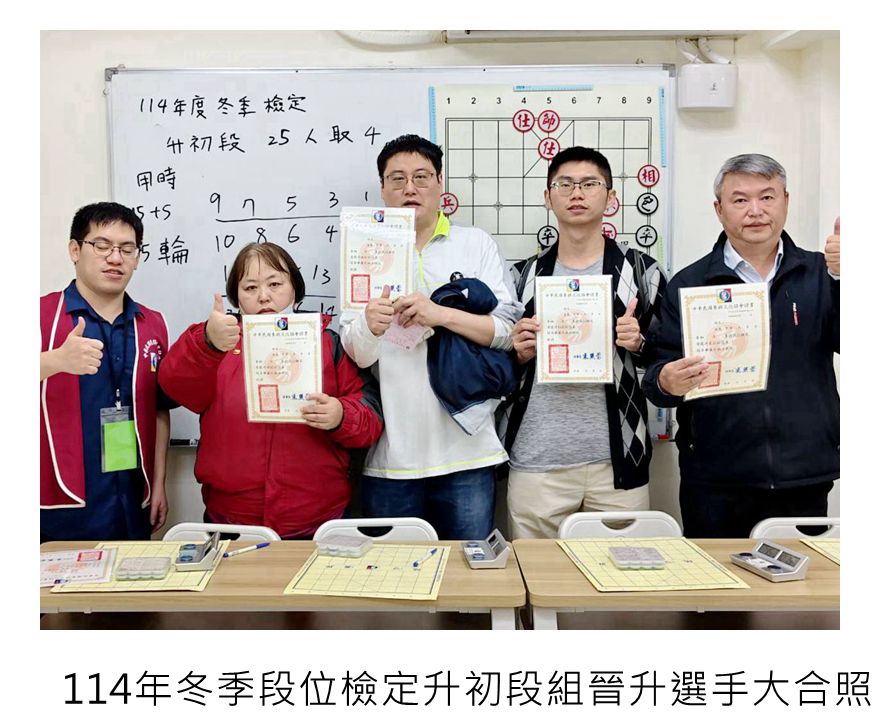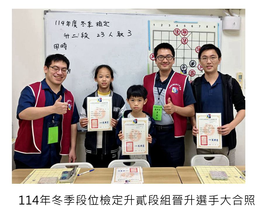 114年冬季象棋段級位檢定賽系列活動,到今天結束,協會114年的對外比賽及棋力檢定賽到此都告一段落,恭喜順利晉級的大小棋友!希望愛下象棋的大小棋友持續關注本協會的相關資訊,平日多多練棋鍛鍊棋力,預告最新出爐的象棋大賽活動資訊,預告近期其他大小比賽活動,寒假檢定賽115年2/01級位檢定賽-上午丁組、下午丙組,2/08級位定賽-上午乙組、下午甲組,3/01段位檢定賽-上午升1、2段組、下午升3、4、5段組,都將陸續展開,相關比賽簡章請看協會比賽官網喔!如果家裡有符合資格的大小朋友,還請繼續報名參賽。