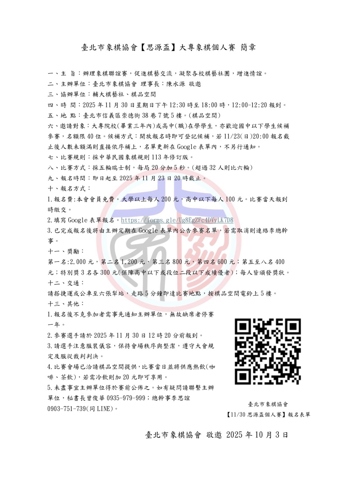臺北市象棋協會【思源盃】大專象棋個人賽 簡章 (114/11/30)