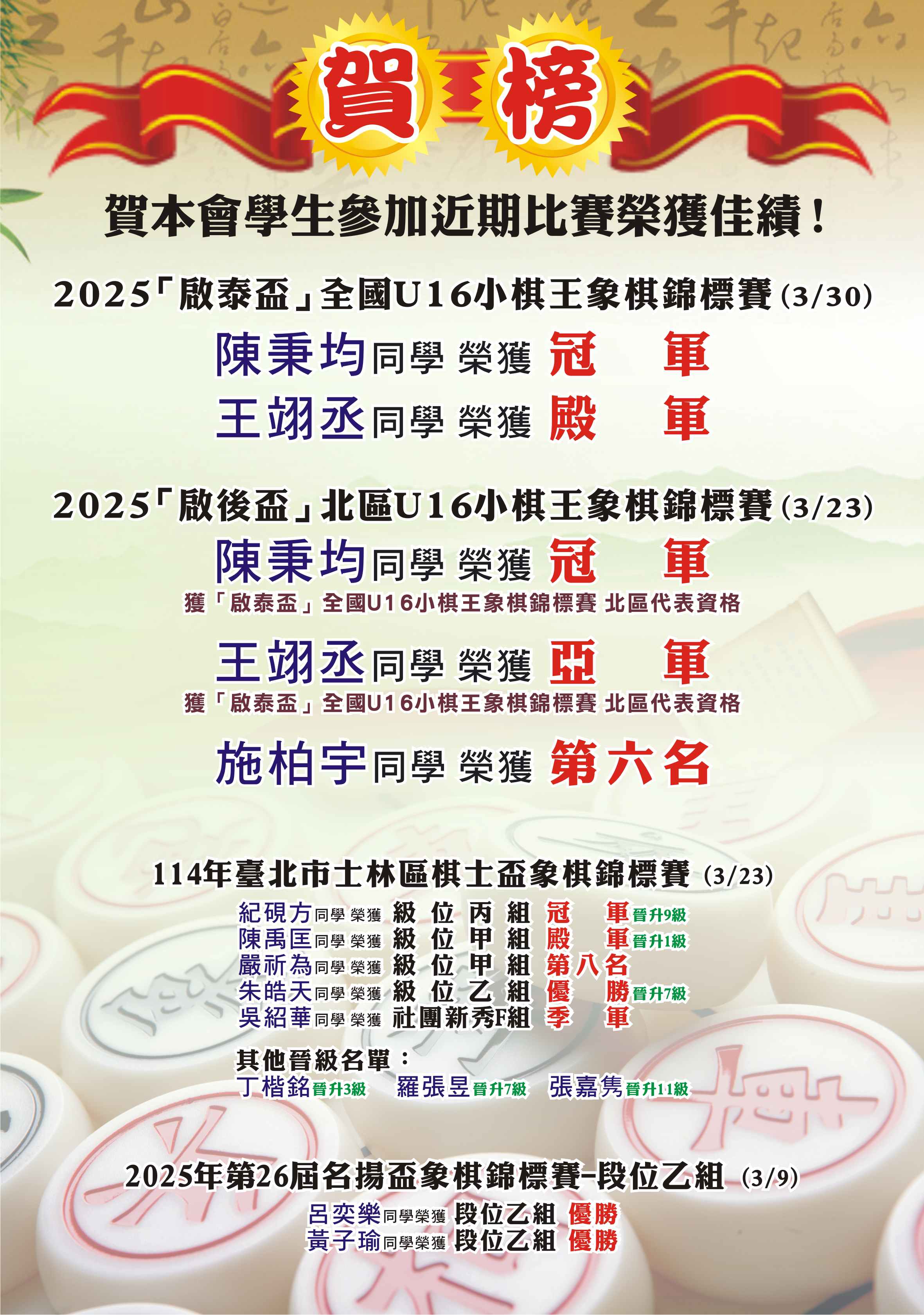 2025年啟泰盃全國U16小棋王、啟後盃北區U16小棋王、士林區棋士盃、名揚盃象棋錦標賽