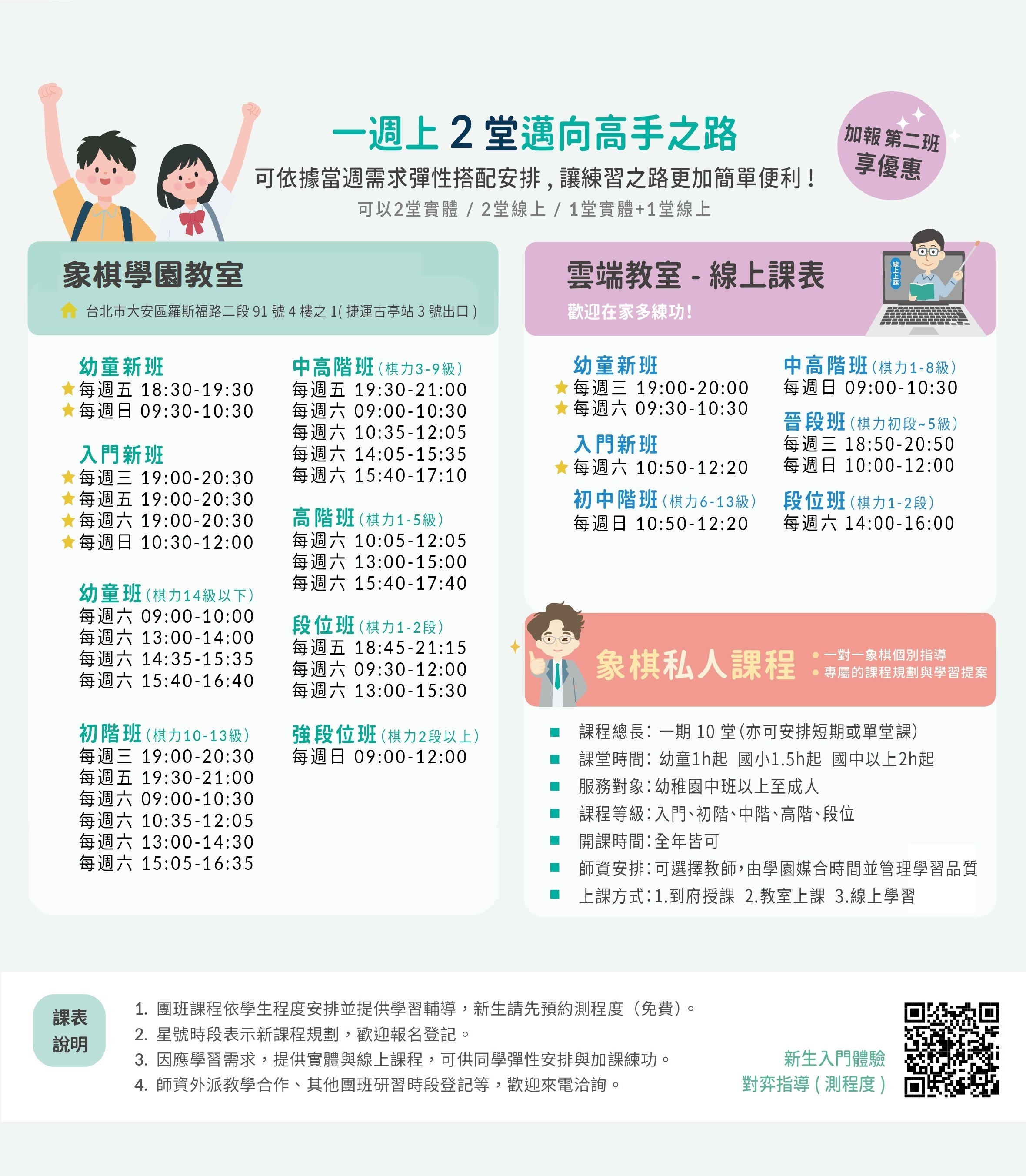 課程將依據學生程度安排,詳細適合時段請洽詢現場老師安排。