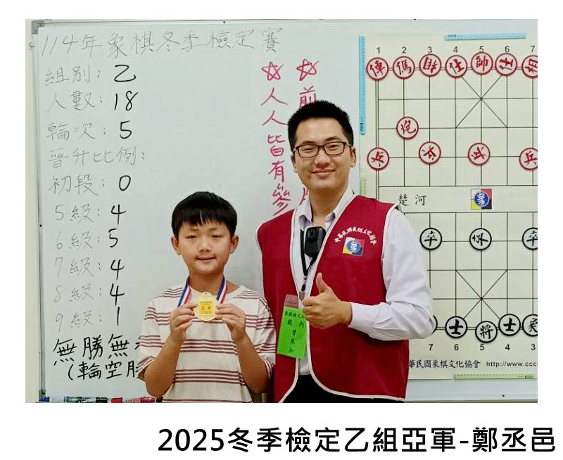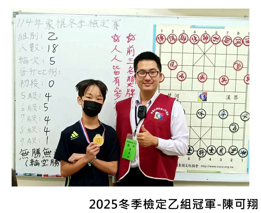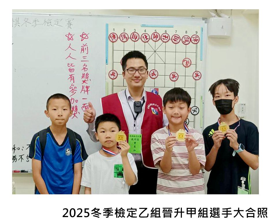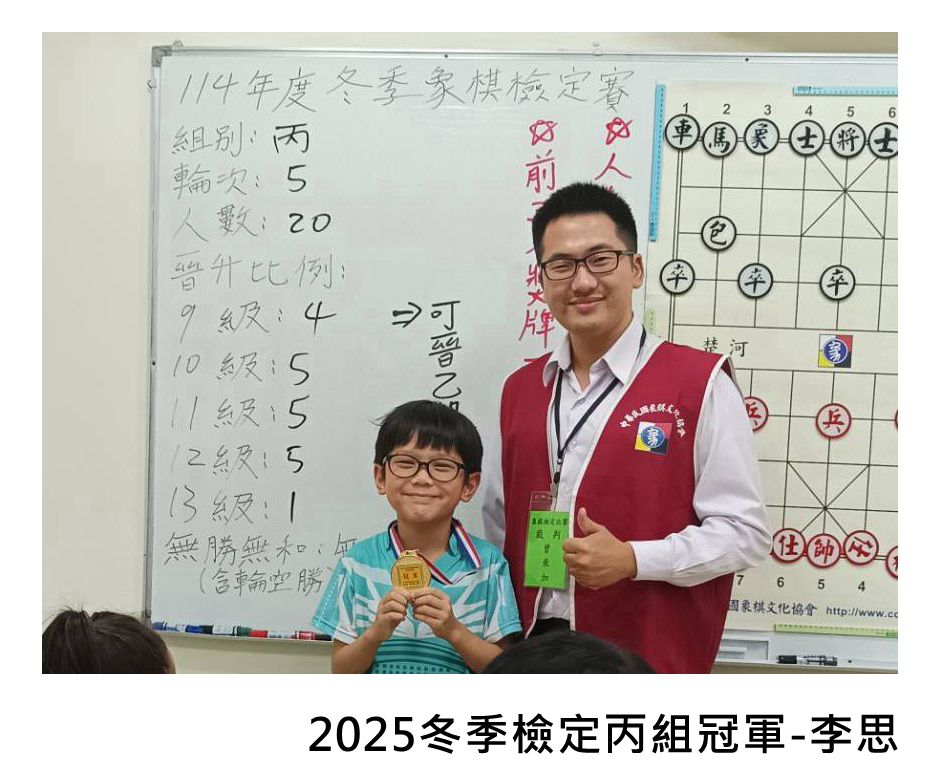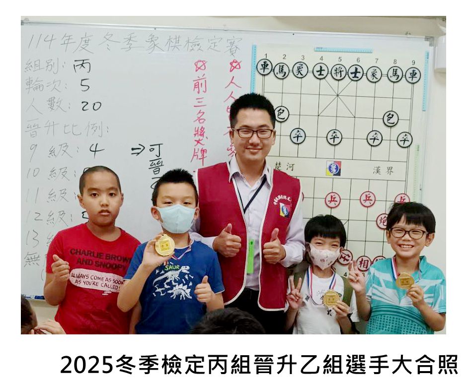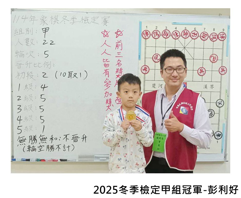 恭喜今天級位乙組檢定陳可翔、鄭丞邑、王辰軒、高千翔等4名選手棋力晉升5級晉升甲組,今天級位甲組檢定晉升初段新生班學員彭利好、李翊榤進場,可以挑戰11月23日中正盃初段組晉升貳段的比賽,惟需辦理初段證書申請並且來電更改比賽組別。今天已經晉升初段的選手不能違規回去下級位甲組的比賽喔!另外,晉升初段的選手亦可報名12月7日早上的升貳段組檢定喔!114年冬季象棋級位檢定賽到今天任務完成,接下來是12月7日的段位組檢定賽!
