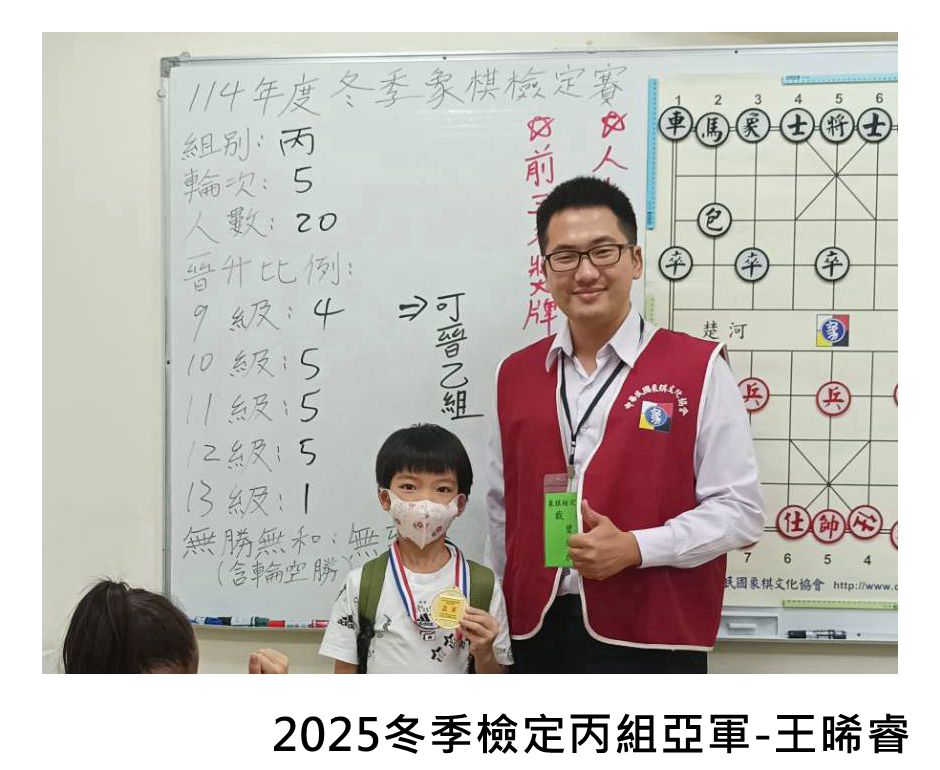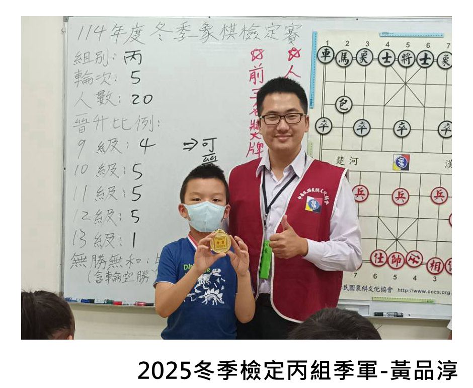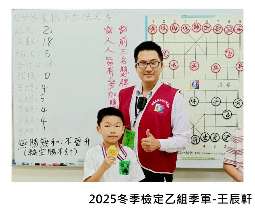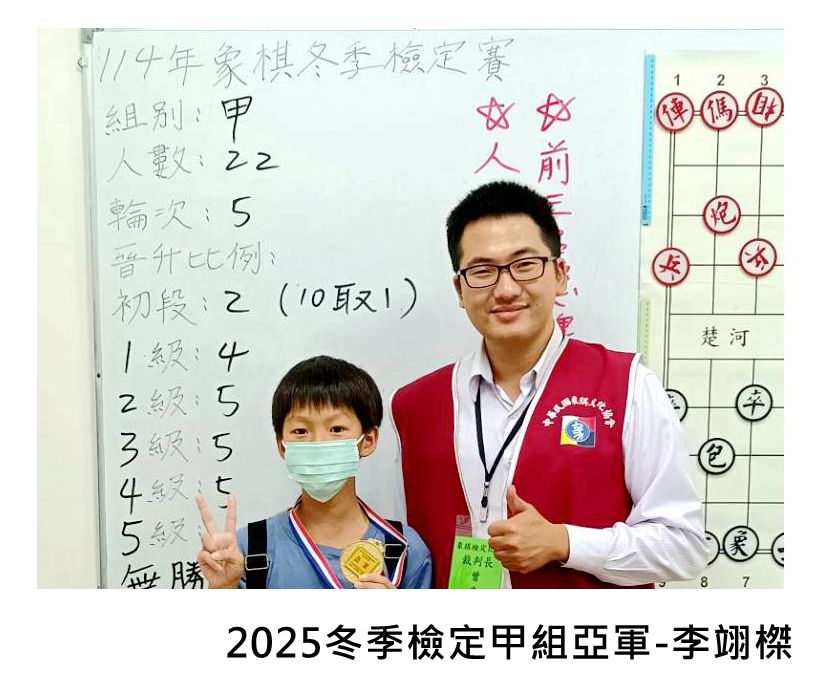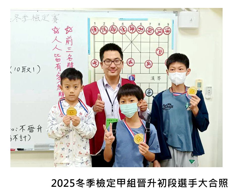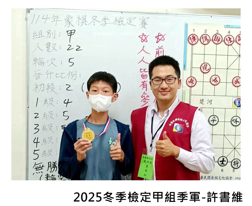 恭喜今天級位乙組檢定陳可翔、鄭丞邑、王辰軒、高千翔等4名選手棋力晉升5級晉升甲組,今天級位甲組檢定晉升初段新生班學員彭利好、李翊榤進場,可以挑戰11月23日中正盃初段組晉升貳段的比賽,惟需辦理初段證書申請並且來電更改比賽組別。今天已經晉升初段的選手不能違規回去下級位甲組的比賽喔!另外,晉升初段的選手亦可報名12月7日早上的升貳段組檢定喔!114年冬季象棋級位檢定賽到今天任務完成,接下來是12月7日的段位組檢定賽!