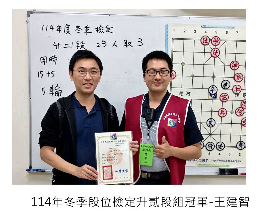 114年冬季象棋段級位檢定賽系列活動,到今天結束,協會114年的對外比賽及棋力檢定賽到此都告一段落,恭喜順利晉級的大小棋友!希望愛下象棋的大小棋友持續關注本協會的相關資訊,平日多多練棋鍛鍊棋力,預告最新出爐的象棋大賽活動資訊,預告近期其他大小比賽活動,寒假檢定賽115年2/01級位檢定賽-上午丁組、下午丙組,2/08級位定賽-上午乙組、下午甲組,3/01段位檢定賽-上午升1、2段組、下午升3、4、5段組,都將陸續展開,相關比賽簡章請看協會比賽官網喔!如果家裡有符合資格的大小朋友,還請繼續報名參賽。