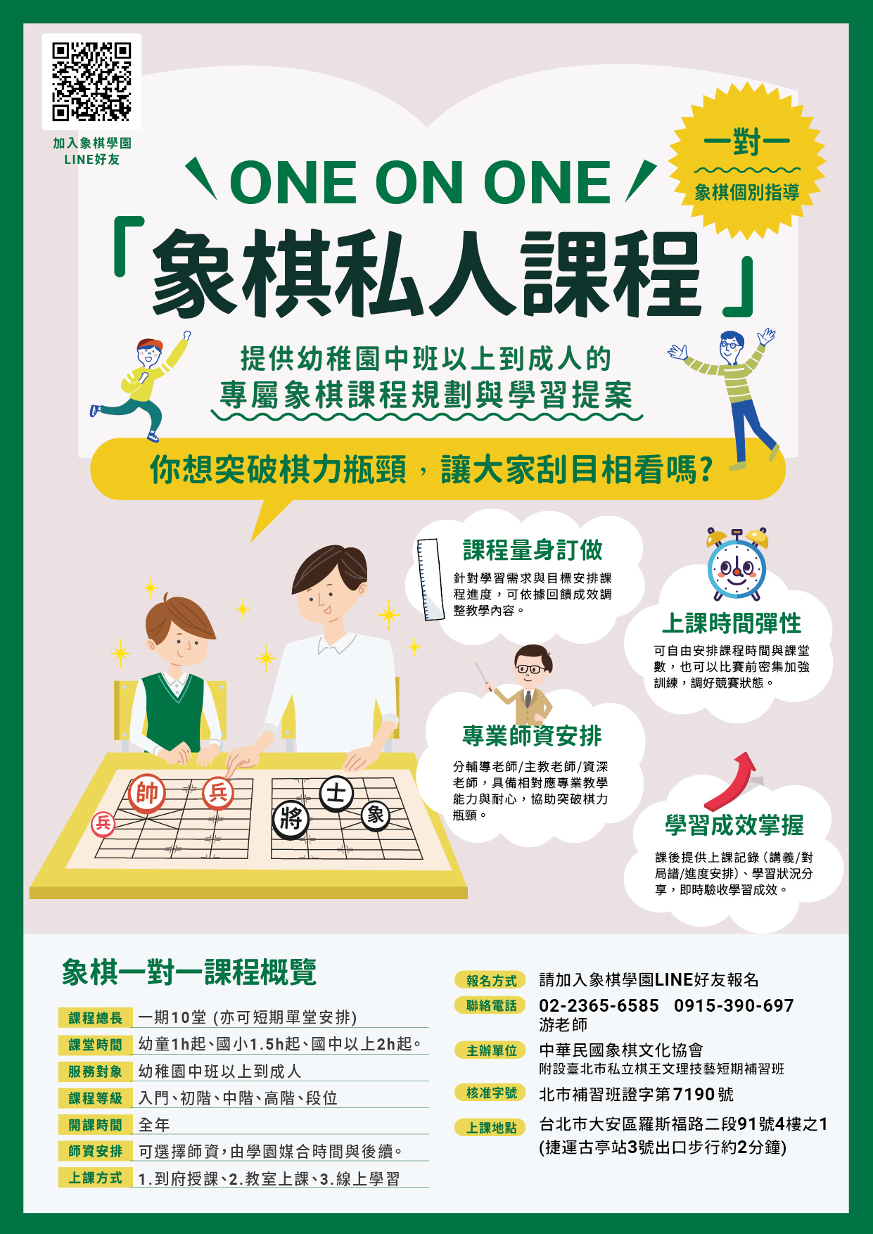 象棋不只是棋盤上的對弈,更是思維與智慧的鍛鍊。而 一對一私人課程,能為學員提供最專業、最有針對性的指導,助你快速突破瓶頸,穩步提升棋力!