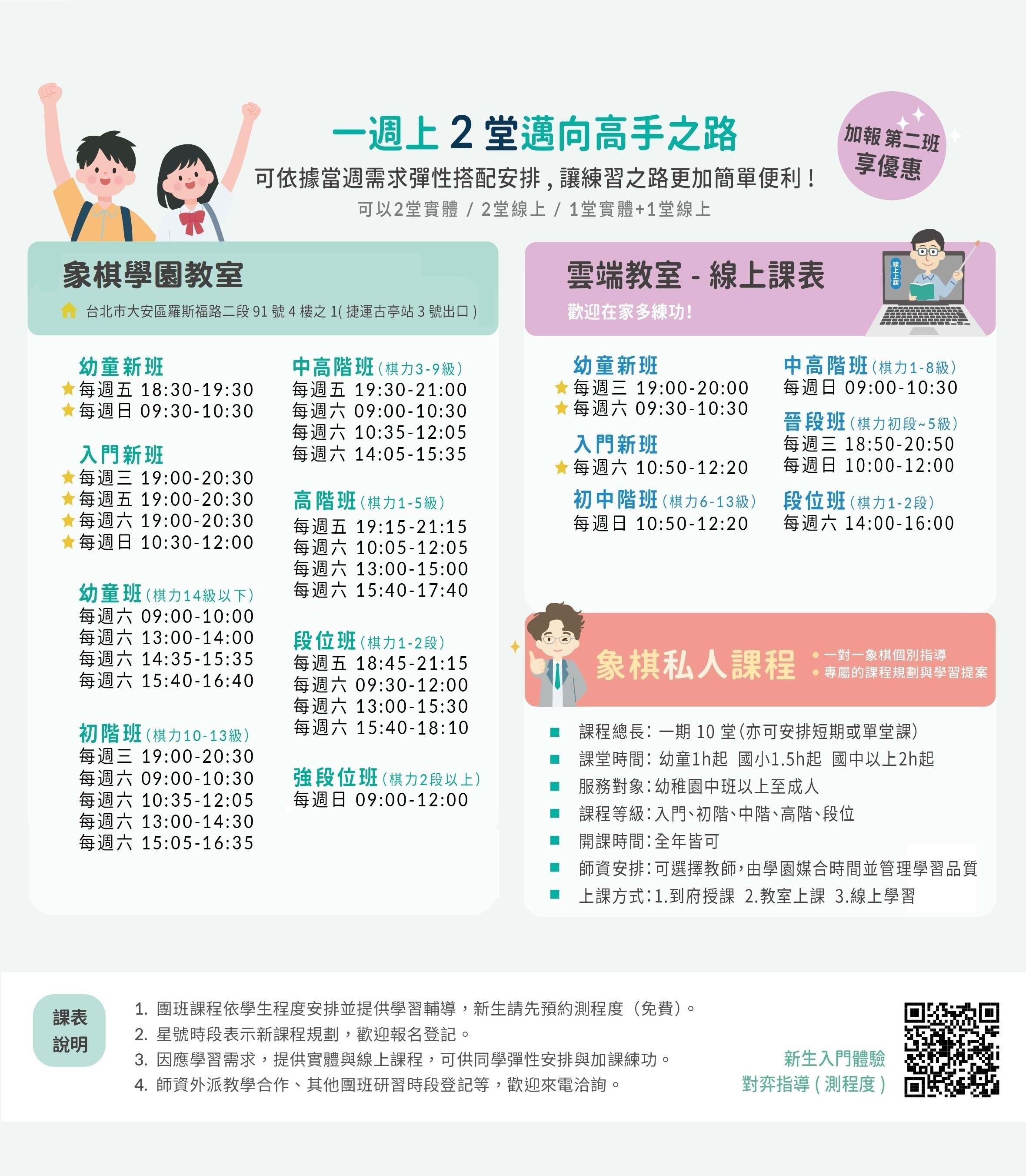 課程將依據學生程度安排,詳細適合時段請洽詢現場老師安排。